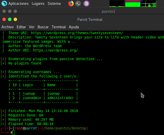 Cuando el comando termina, nos devuelve todos los logins disponibles para esa instalación de Wordpress, por lo que ya sabemos nombres de usuario con los que intentar entrar: