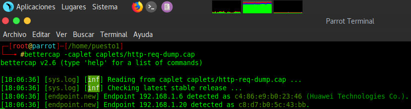 Desconozco si en Kali será necesario realizar este paso, pero en Parrot la versión preinstalada de bettercap, además de no incluir ningún caplet instalado por defecto, me daba problemas a la hora de capturar datos, lo cual solucioné actualizando bettercap a su última versión.